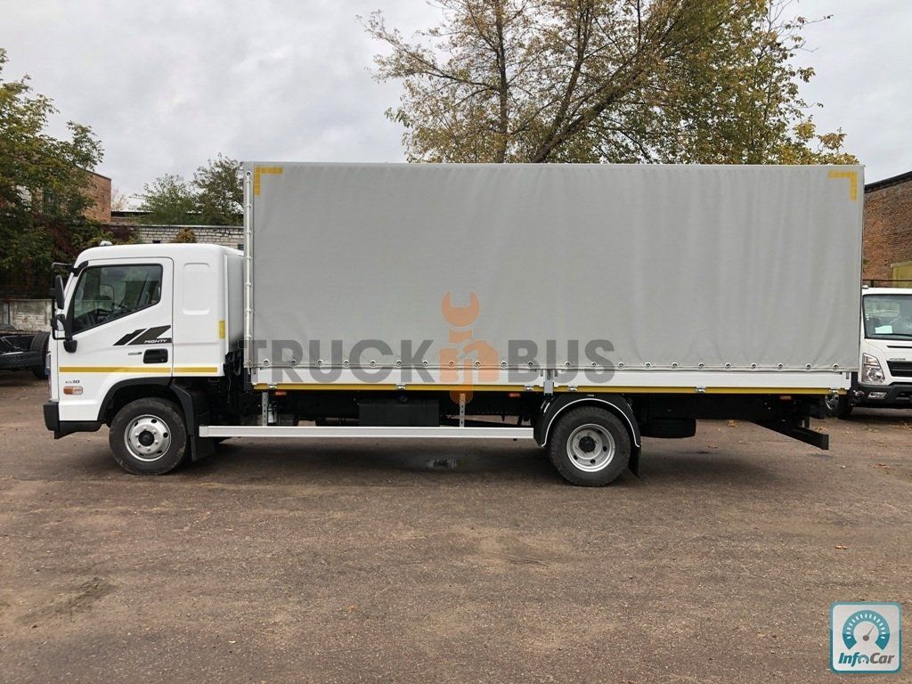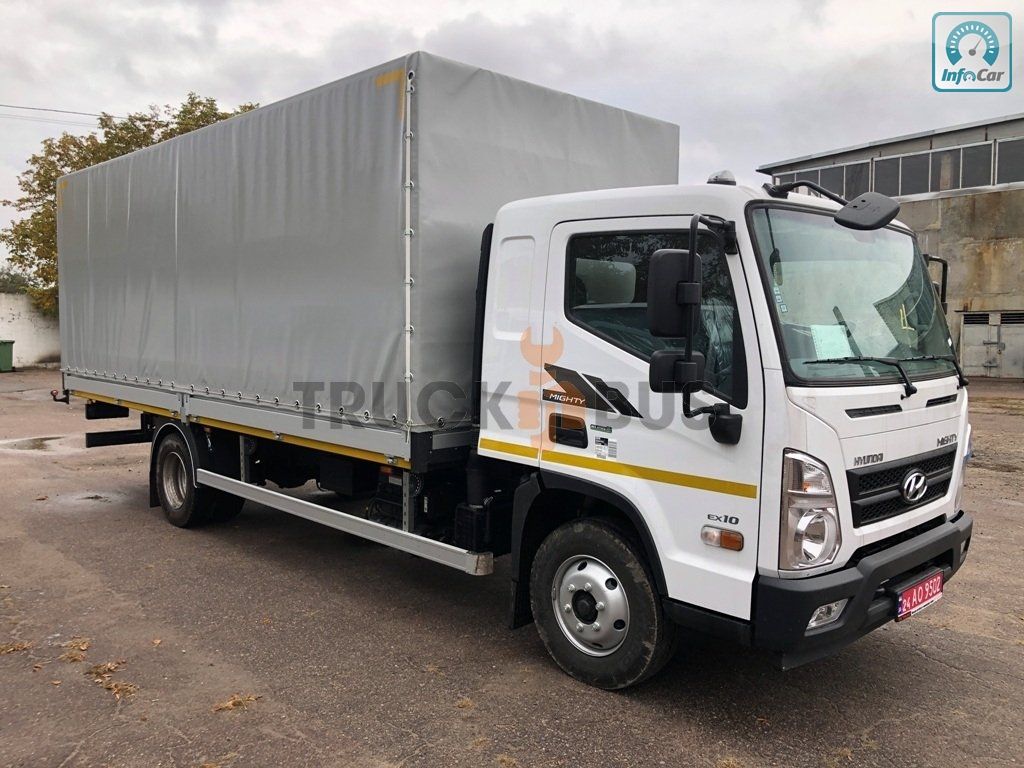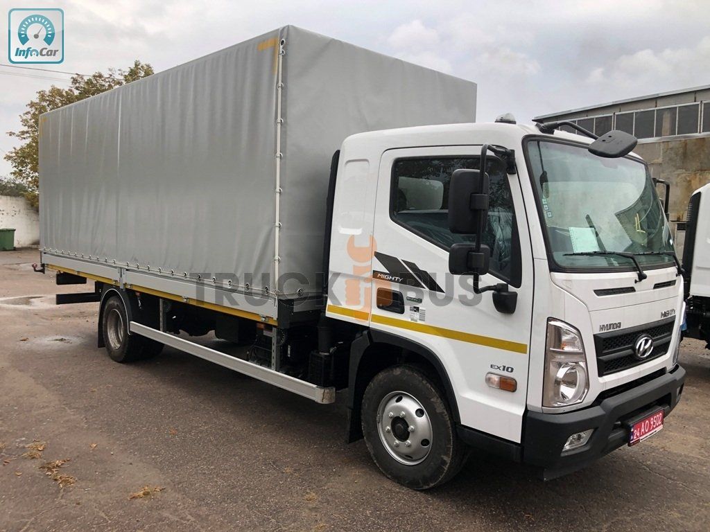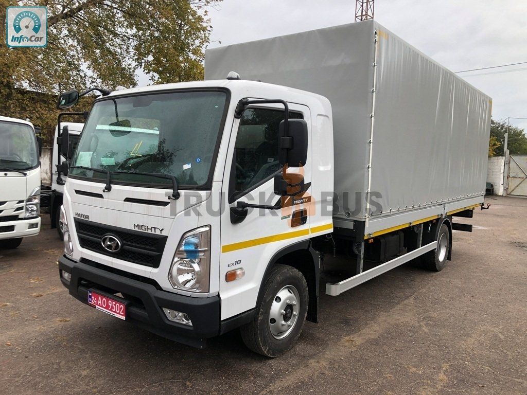 Вантажний автомобіль Hyundai EX10 Super Cab Extra Long з бортовою платформою з тентом. 2026 рік виготовлення. Повна маса 10 300 кг. Вантажопідйомність шасі 7365 кг. Потужність дизельного двигуна 170 к.с. Об′єм двигуна 3933 см3. Євро 5. Колісна база шасі 4 400 мм. Довжина шасі 7370 мм.
